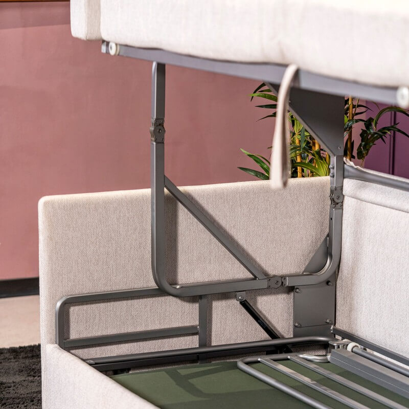 The MORFF features a bench-seat sofa that uses its soft open/close mechanism and hidden pistons to transform into a twin bunk bed. The MORFF also features a locking ladder to easily climb onto the top bunk bed. When not in use, the ladder hardware is effectively hidden by the bench-seat sofa.
